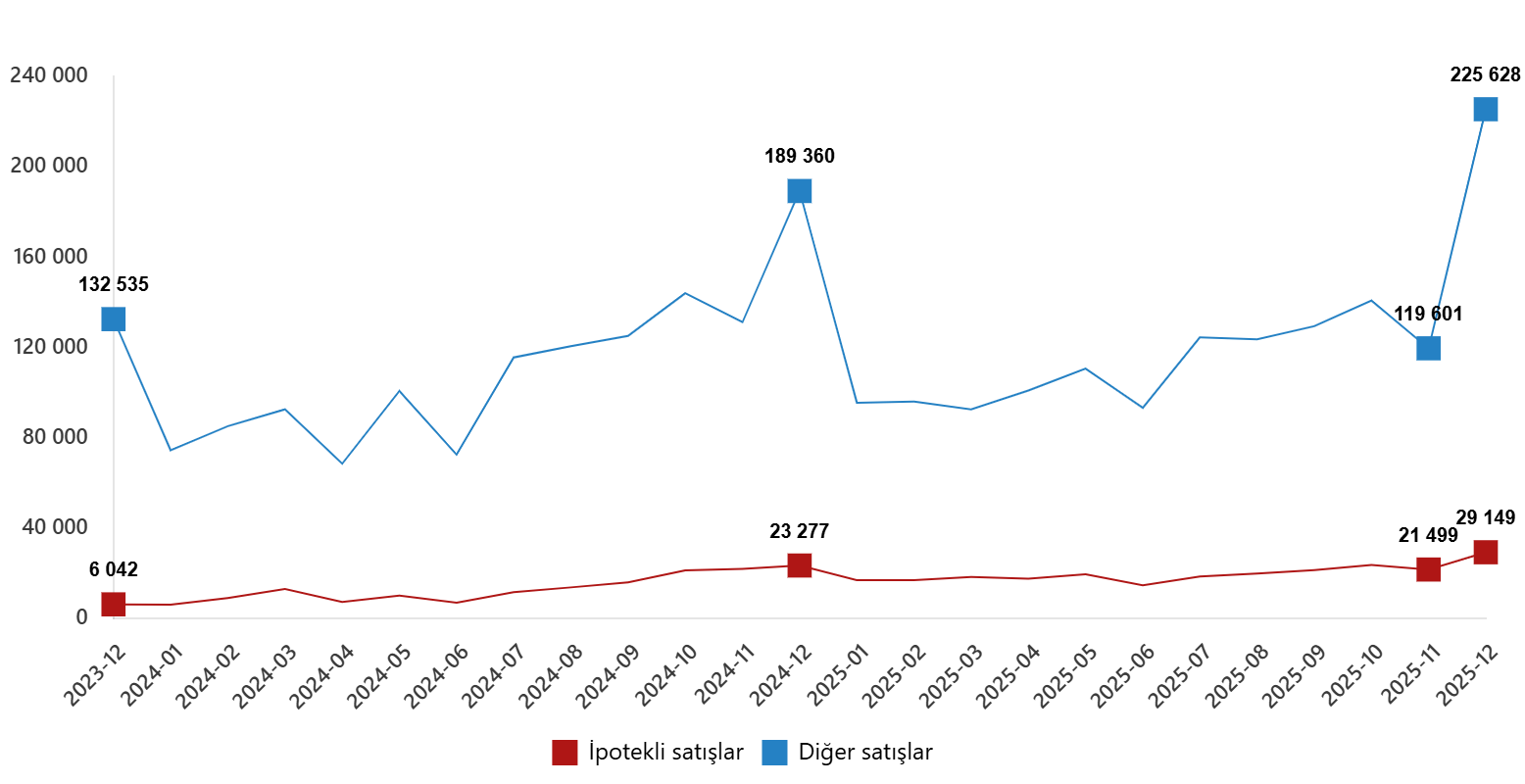 Türkiye genelinde ipotekli konut satışları Aralık ayında bir evvelki yılın tıpkı ayına nazaran %25,2 oranında artarak 29 bin 149 oldu. 2025 yılında gerçekleşen ipotekli konut satışları ise bir evvelki yıla nazaran %49,3 oranında artarak 236 bin 668 oldu. Toplam konut satışları içinde ipotekli satışların hissesi Aralık ayında %11,4, 2025 yılında %14,0 olarak gerçekleşti.