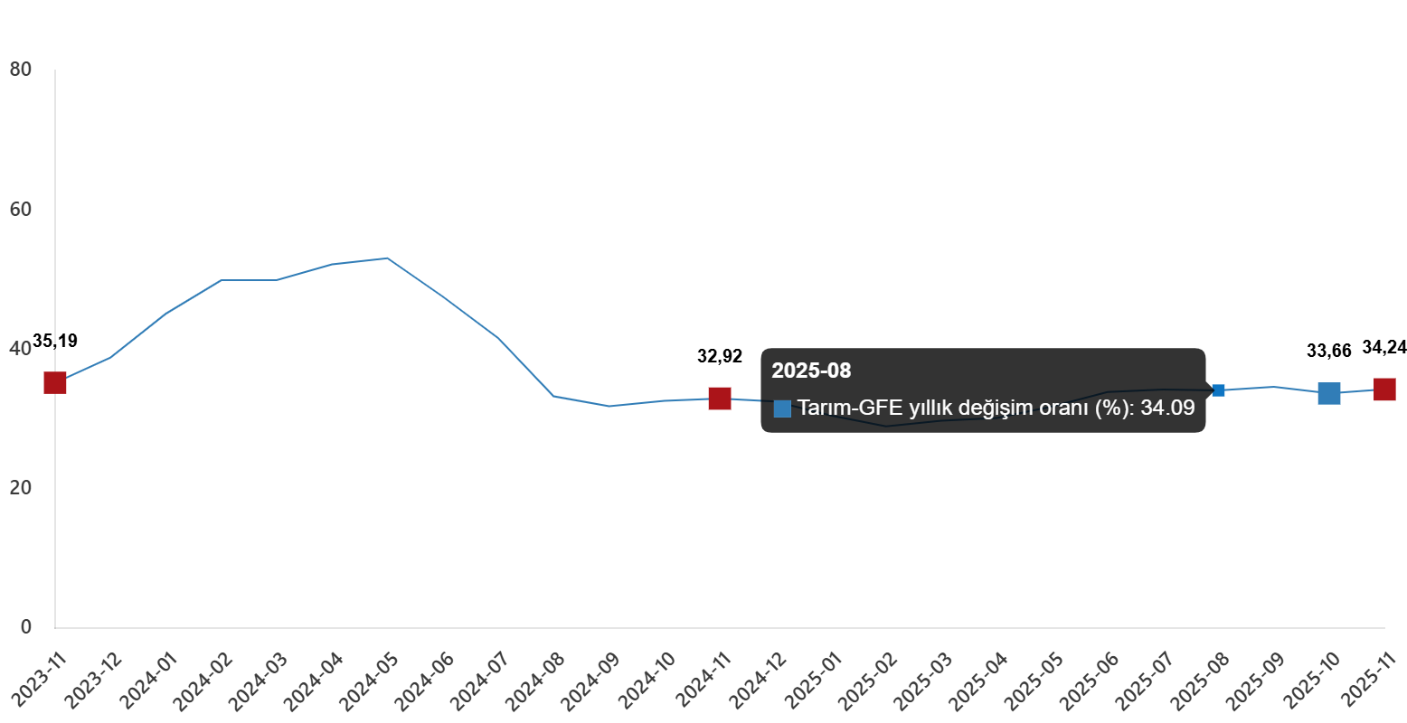 Tarım-GFE’de (2020=100), 2025 yılı Kasım ayında bir evvelki aya nazaran %1,84 artış, bir evvelki yılın Aralık ayına nazaran %31,43 artış, bir evvelki yılın tıpkı ayına nazaran %34,24 artış ve on iki aylık ortalamalara nazaran %32,44 artış gerçekleşti.