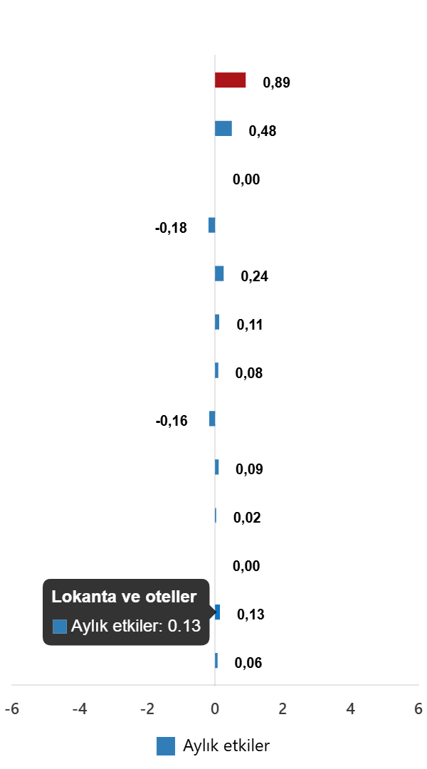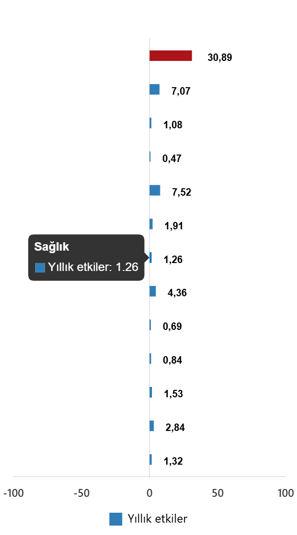 En yüksek tartıya sahip 3 ana harcama kümesinin yıllık değişimleri; besin ve alkolsüz içeceklerde %28,31 artış, ulaştırmada %28,44 artış ve konutta %49,45 artış olarak gerçekleşti. İlgili ana kümelerin yıllık değişime olan tesirleri ise besin ve alkolsüz içeceklerde %7,07, ulaştırmada %4,36 ve konutta %7,52 oldu.